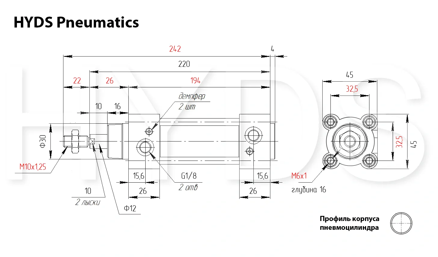 Пневмоцилиндр HYDS серии C96, артикул C96SDB32-100C с диаметром поршня 32 мм и длинной хода 100 мм, двухстороннего действия с односторонним штоком изготовленный по стандарту ISO 15552 (6431) / VDMA 24562, используется для преобразования энергии сжатого воздуха в механическую работу. Теоретическое усилие цилиндра при 6 Бар на выдвижение: 426 Н ~ (43 КГ), на втягивание: 366 Н ~ (37 КГ). Расход воздуха пневмоцилиндром при 6 Бар составляет: 1.04 Н/л за один цикл работы. Скорость движения штока без нагрузки: минимальная - 10 мм/сек, максимальная - 1000 мм/сек. Широкий выбор монтажных принадлежностей позволяет установить цилиндр где угодно.