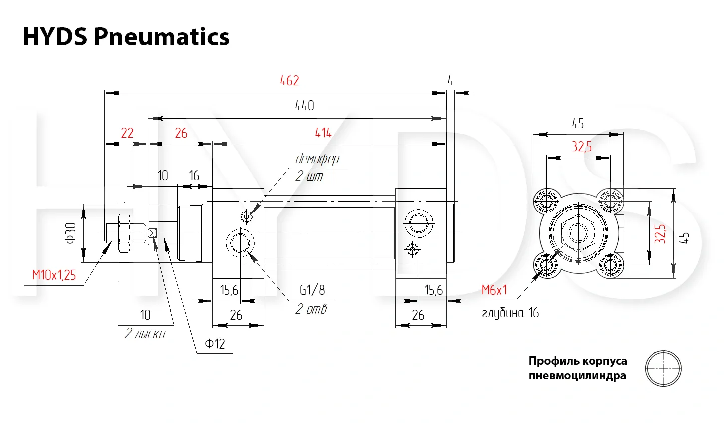 Пневмоцилиндр HYDS серии C96, артикул C96SDB32-320C с диаметром поршня 32 мм и длинной хода 320 мм, двухстороннего действия с односторонним штоком изготовленный по стандарту ISO 15552 (6431) / VDMA 24562, используется для преобразования энергии сжатого воздуха в механическую работу. Теоретическое усилие цилиндра при 6 Бар на выдвижение: 426 Н ~ (43 КГ), на втягивание: 366 Н ~ (37 КГ). Расход воздуха пневмоцилиндром при 6 Бар составляет: 3.328 Н/л за один цикл работы. Скорость движения штока без нагрузки: минимальная - 10 мм/сек, максимальная - 1000 мм/сек. Широкий выбор монтажных принадлежностей позволяет установить цилиндр где угодно.