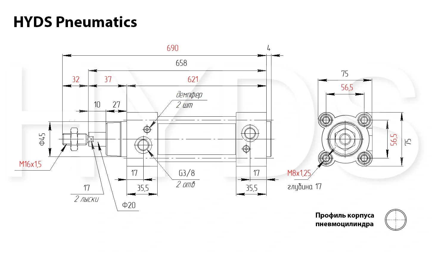 Пневмоцилиндр HYDS серии C96, артикул C96SDB63-500C с диаметром поршня 63 мм и длинной хода 500 мм, двухстороннего действия с односторонним штоком изготовленный по стандарту ISO 15552 (6431) / VDMA 24562, используется для преобразования энергии сжатого воздуха в механическую работу. Теоретическое усилие цилиндра при 6 Бар на выдвижение: 1651 Н ~ (168 КГ), на втягивание: 1484 Н ~ (151 КГ). Расход воздуха пневмоцилиндром при 6 Бар составляет: 20.7 Н/л за один цикл работы. Скорость движения штока без нагрузки: минимальная - 10 мм/сек, максимальная - 1000 мм/сек. Широкий выбор монтажных принадлежностей позволяет установить цилиндр где угодно.