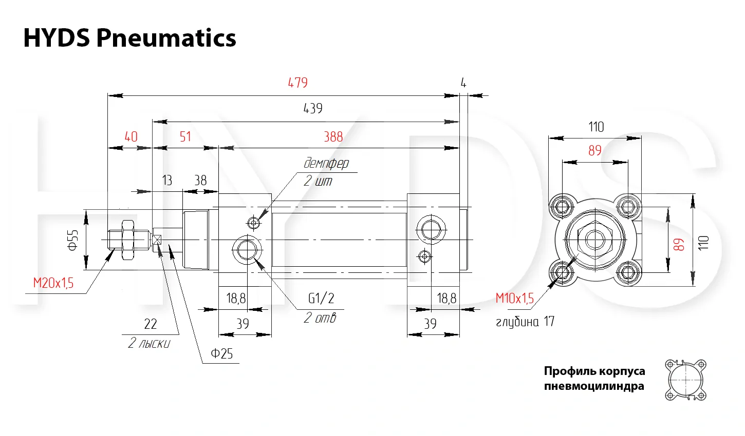 Пневмоцилиндр HYDS серии CP96, артикул CP96SDB100-250C с диаметром поршня 100 мм и длинной хода 250 мм, двухстороннего действия с односторонним штоком изготовленный по стандарту ISO 15552 (6431) / VDMA 24562, используется для преобразования энергии сжатого воздуха в механическую работу. Теоретическое усилие цилиндра при 6 Бар на выдвижение: 4159 Н ~ (424 КГ), на втягивание: 3899 Н ~ (398 КГ). Расход воздуха пневмоцилиндром при 6 Бар составляет: 26.625 Н/л за один цикл работы. Скорость движения штока без нагрузки: минимальная - 10 мм/сек, максимальная - 1000 мм/сек. Широкий выбор монтажных принадлежностей позволяет установить цилиндр где угодно.