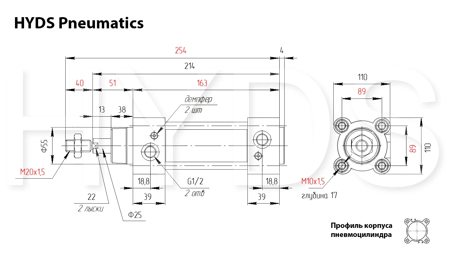 Пневмоцилиндр HYDS серии CP96, артикул CP96SDB100-25C с диаметром поршня 100 мм и длинной хода 25 мм, двухстороннего действия с односторонним штоком изготовленный по стандарту ISO 15552 (6431) / VDMA 24562, используется для преобразования энергии сжатого воздуха в механическую работу. Теоретическое усилие цилиндра при 6 Бар на выдвижение: 4159 Н ~ (424 КГ), на втягивание: 3899 Н ~ (398 КГ). Расход воздуха пневмоцилиндром при 6 Бар составляет: 2.663 Н/л за один цикл работы. Скорость движения штока без нагрузки: минимальная - 10 мм/сек, максимальная - 1000 мм/сек. Широкий выбор монтажных принадлежностей позволяет установить цилиндр где угодно.