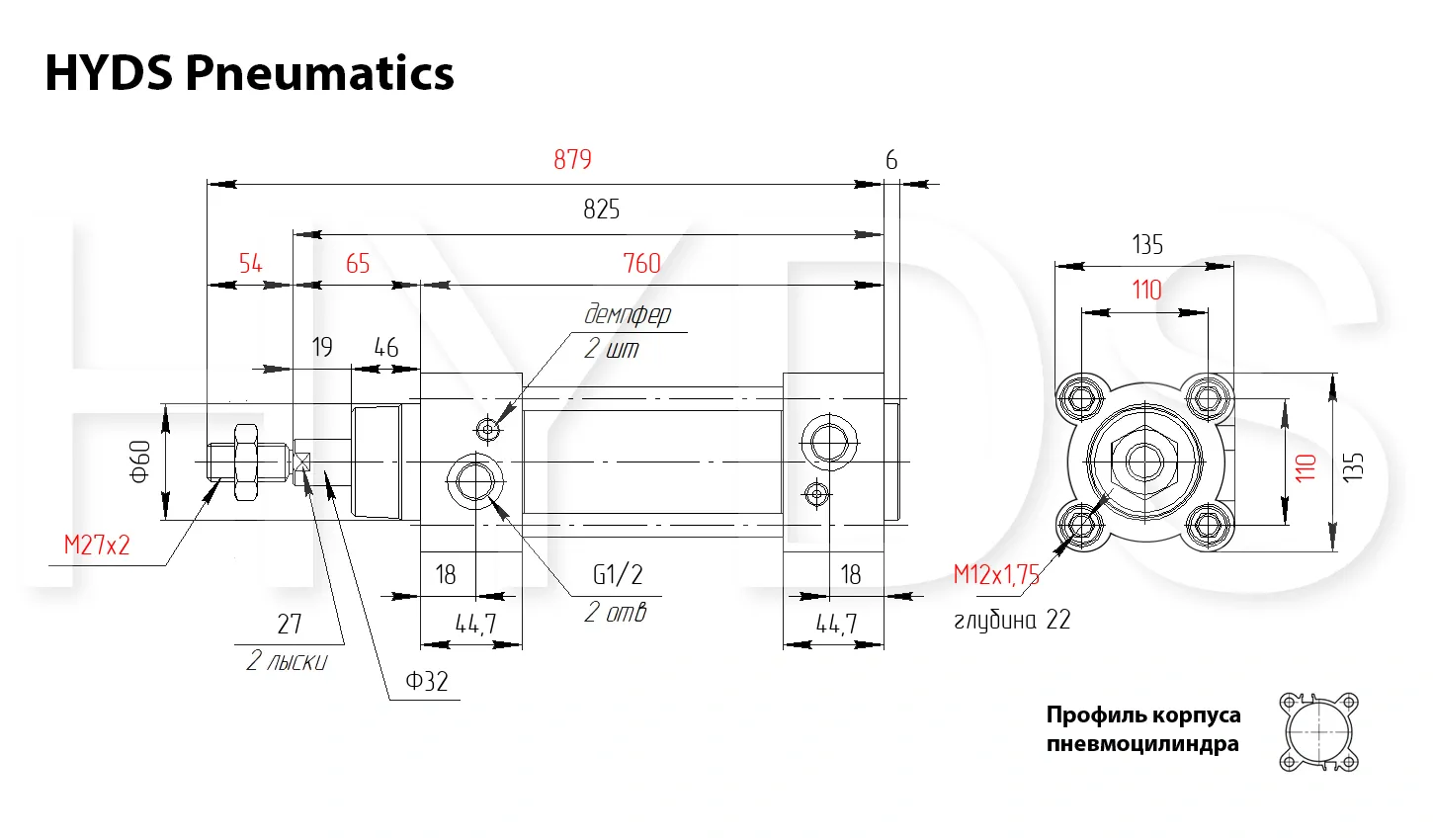 Красным выделены значения, на которые стоит обратить внимание при выборе пневмоцилиндра