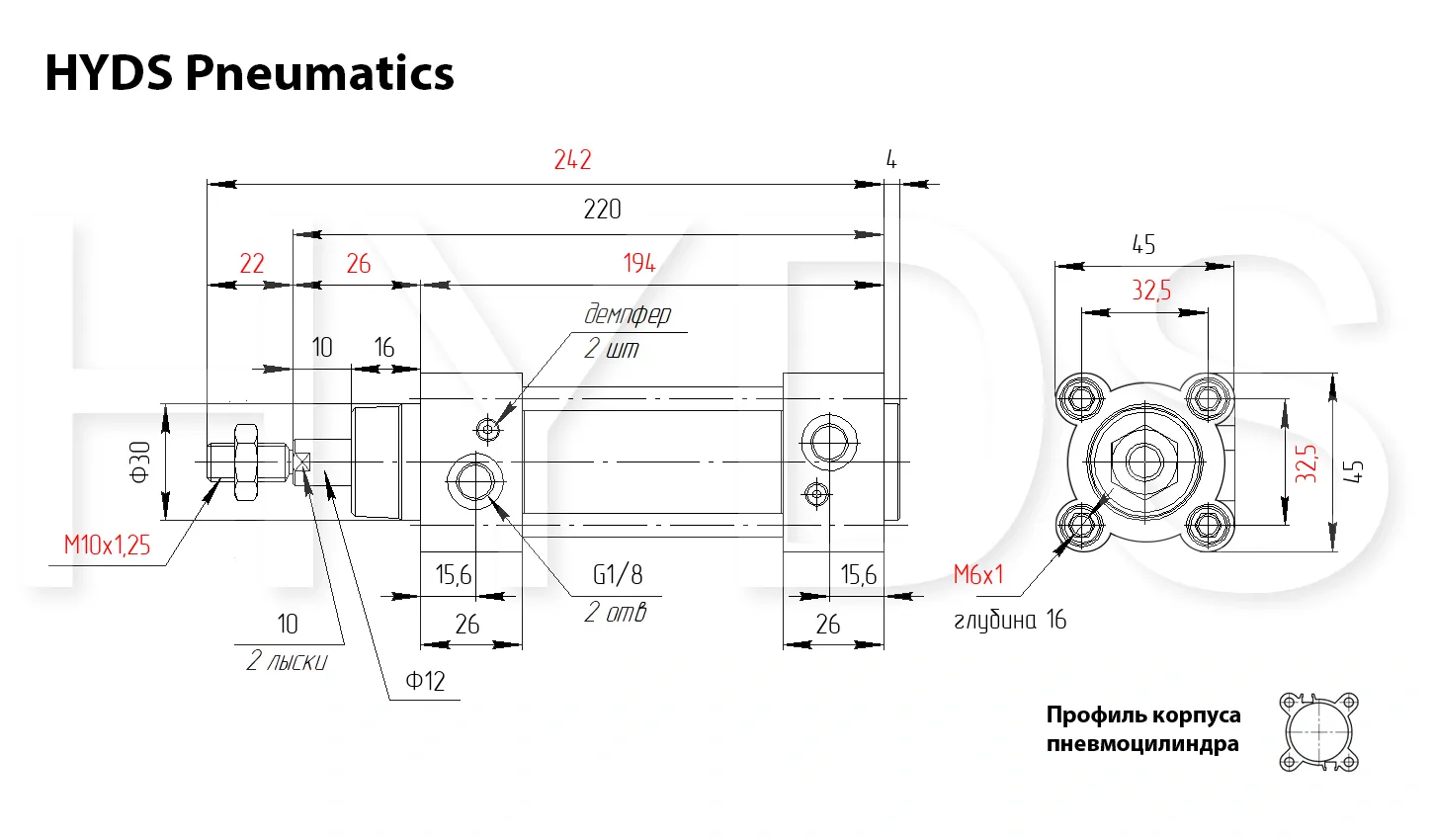 Пневмоцилиндр HYDS серии CP96, артикул CP96SDB32-100C с диаметром поршня 32 мм и длинной хода 100 мм, двухстороннего действия с односторонним штоком изготовленный по стандарту ISO 15552 (6431) / VDMA 24562, используется для преобразования энергии сжатого воздуха в механическую работу. Теоретическое усилие цилиндра при 6 Бар на выдвижение: 426 Н ~ (43 КГ), на втягивание: 366 Н ~ (37 КГ). Расход воздуха пневмоцилиндром при 6 Бар составляет: 1.04 Н/л за один цикл работы. Скорость движения штока без нагрузки: минимальная - 10 мм/сек, максимальная - 1000 мм/сек. Широкий выбор монтажных принадлежностей позволяет установить цилиндр где угодно.