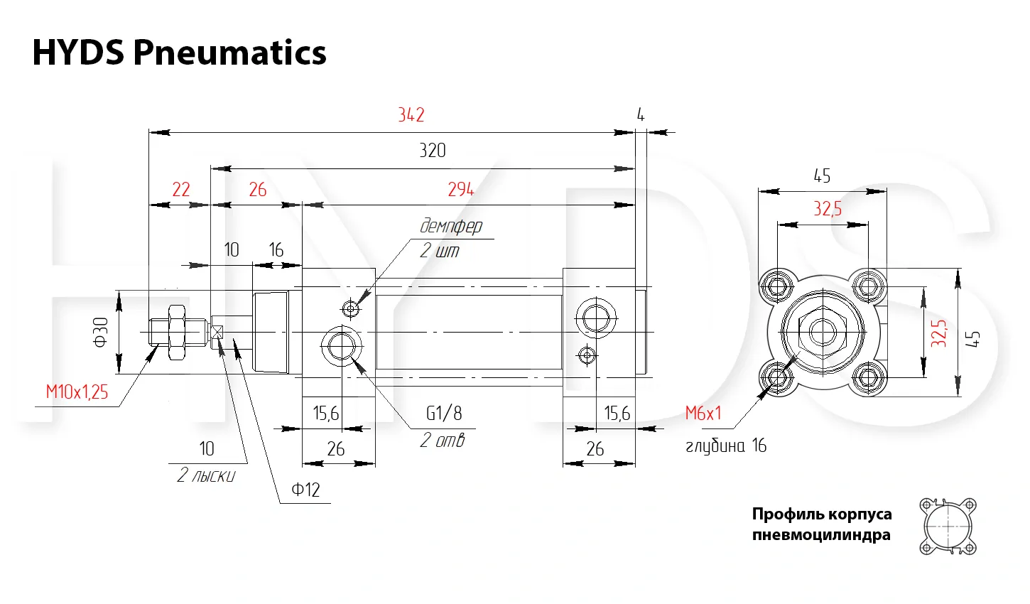 Пневмоцилиндр HYDS серии CP96, артикул CP96SDB32-200C с диаметром поршня 32 мм и длинной хода 200 мм, двухстороннего действия с односторонним штоком изготовленный по стандарту ISO 15552 (6431) / VDMA 24562, используется для преобразования энергии сжатого воздуха в механическую работу. Теоретическое усилие цилиндра при 6 Бар на выдвижение: 426 Н ~ (43 КГ), на втягивание: 366 Н ~ (37 КГ). Расход воздуха пневмоцилиндром при 6 Бар составляет: 2.08 Н/л за один цикл работы. Скорость движения штока без нагрузки: минимальная - 10 мм/сек, максимальная - 1000 мм/сек. Широкий выбор монтажных принадлежностей позволяет установить цилиндр где угодно.