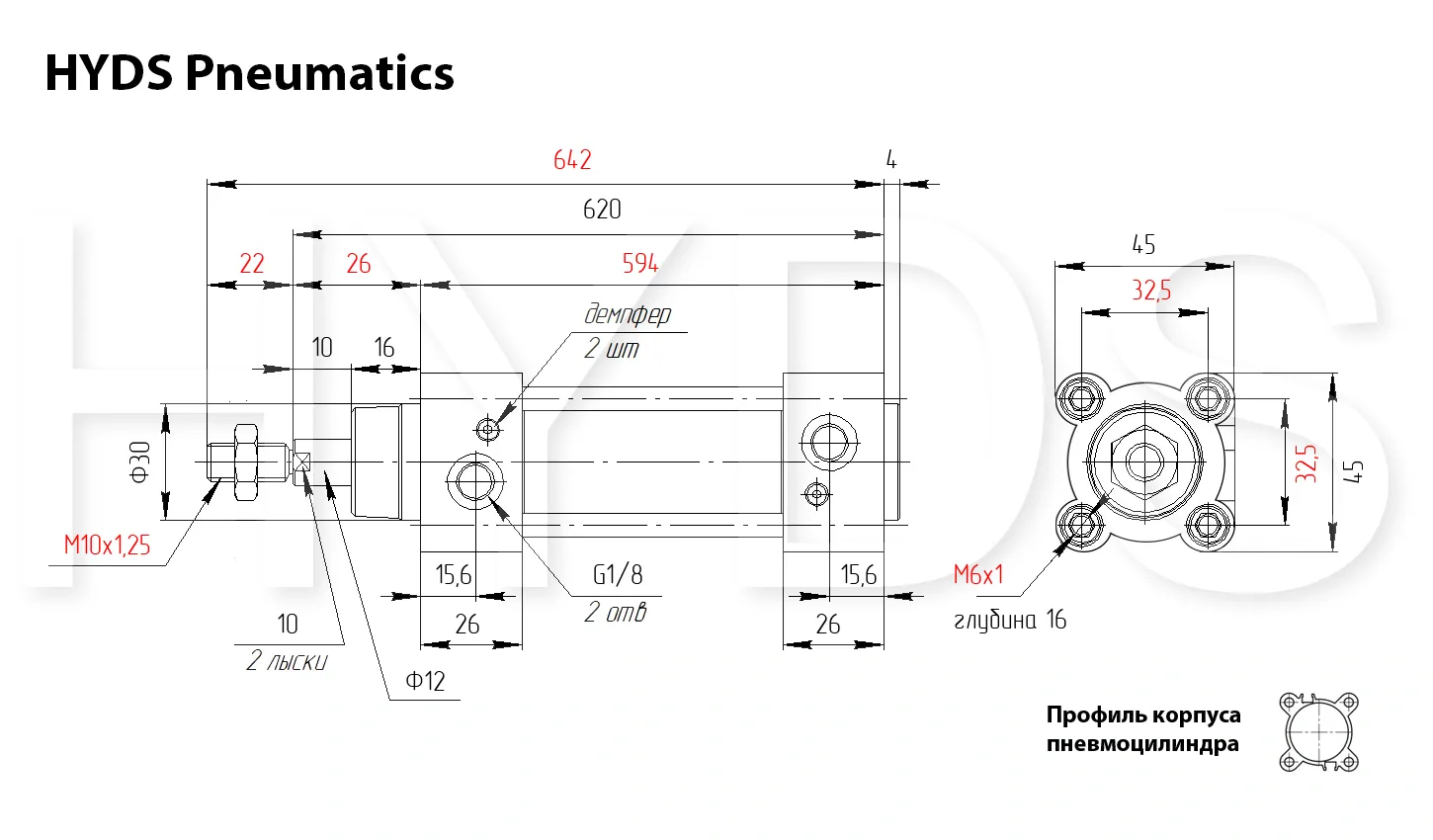 Пневмоцилиндр HYDS серии CP96, артикул CP96SDB32-500C с диаметром поршня 32 мм и длинной хода 500 мм, двухстороннего действия с односторонним штоком изготовленный по стандарту ISO 15552 (6431) / VDMA 24562, используется для преобразования энергии сжатого воздуха в механическую работу. Теоретическое усилие цилиндра при 6 Бар на выдвижение: 426 Н ~ (43 КГ), на втягивание: 366 Н ~ (37 КГ). Расход воздуха пневмоцилиндром при 6 Бар составляет: 5.2 Н/л за один цикл работы. Скорость движения штока без нагрузки: минимальная - 10 мм/сек, максимальная - 1000 мм/сек. Широкий выбор монтажных принадлежностей позволяет установить цилиндр где угодно.