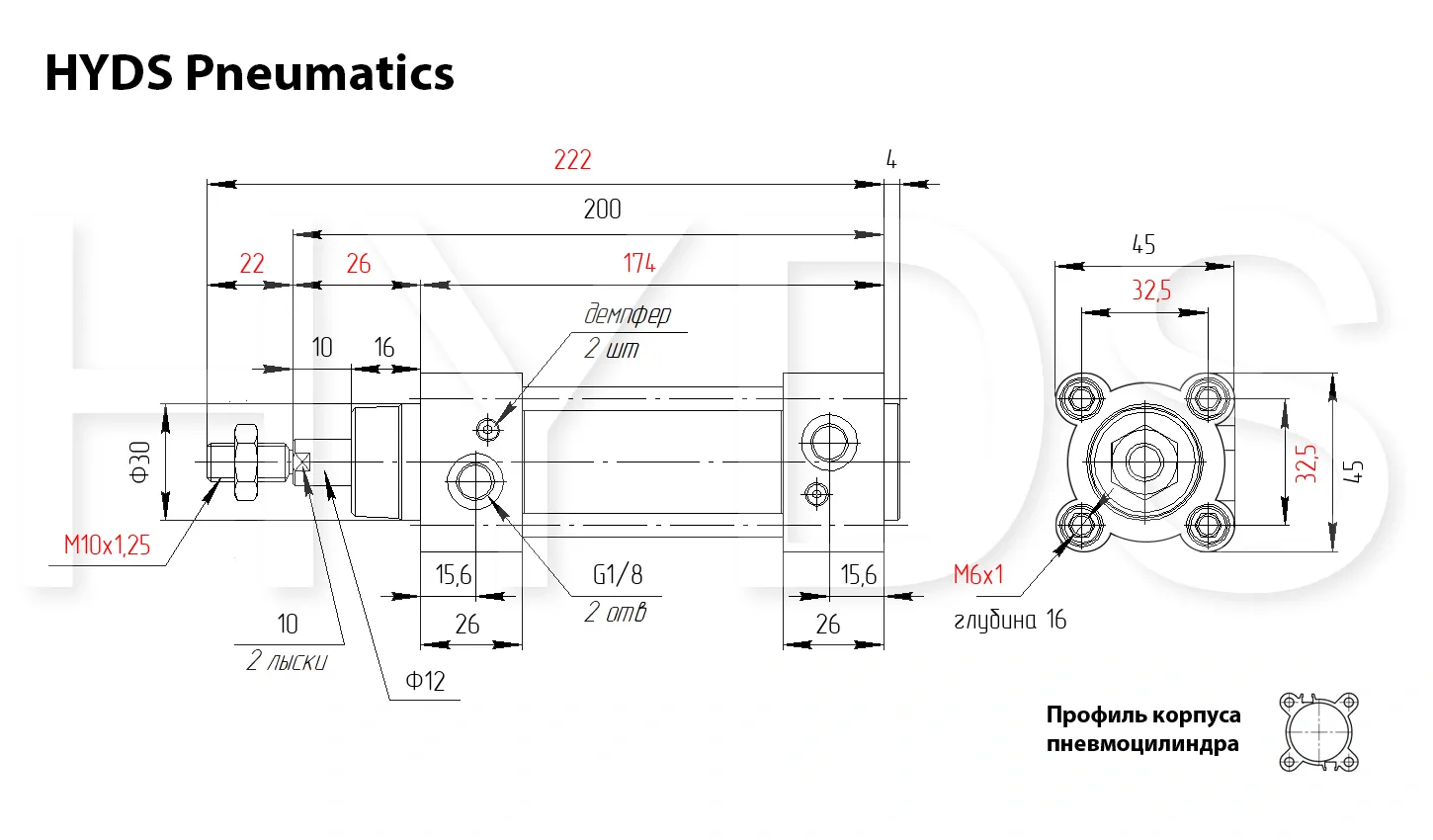 Пневмоцилиндр HYDS серии CP96, артикул CP96SDB32-80C с диаметром поршня 32 мм и длинной хода 80 мм, двухстороннего действия с односторонним штоком изготовленный по стандарту ISO 15552 (6431) / VDMA 24562, используется для преобразования энергии сжатого воздуха в механическую работу. Теоретическое усилие цилиндра при 6 Бар на выдвижение: 426 Н ~ (43 КГ), на втягивание: 366 Н ~ (37 КГ). Расход воздуха пневмоцилиндром при 6 Бар составляет: 0.832 Н/л за один цикл работы. Скорость движения штока без нагрузки: минимальная - 10 мм/сек, максимальная - 1000 мм/сек. Широкий выбор монтажных принадлежностей позволяет установить цилиндр где угодно.