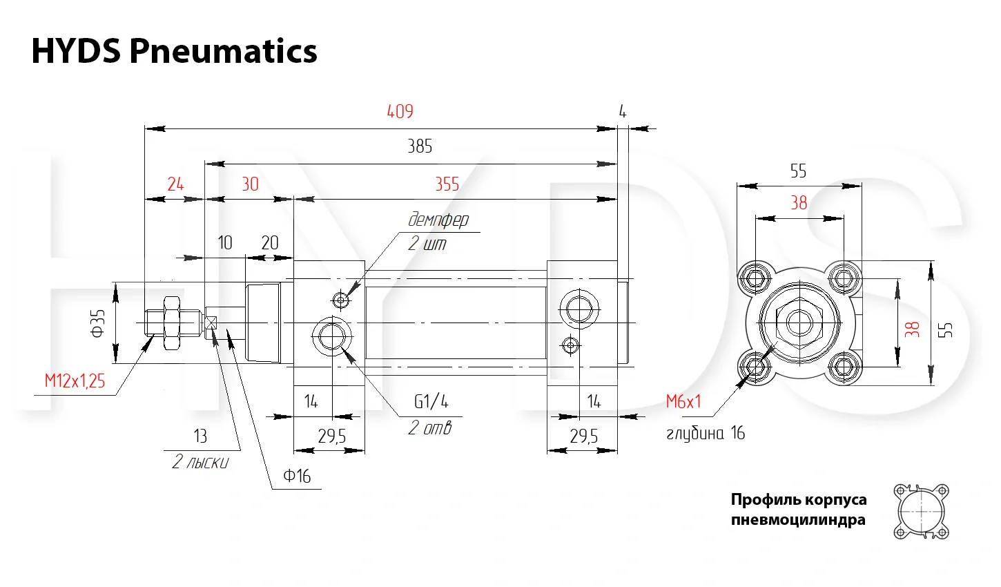 Пневмоцилиндр HYDS серии CP96, артикул CP96SDB40-250C с диаметром поршня 40 мм и длинной хода 250 мм, двухстороннего действия с односторонним штоком изготовленный по стандарту ISO 15552 (6431) / VDMA 24562, используется для преобразования энергии сжатого воздуха в механическую работу. Теоретическое усилие цилиндра при 6 Бар на выдвижение: 665 Н ~ (68 КГ), на втягивание: 559 Н ~ (57 КГ). Расход воздуха пневмоцилиндром при 6 Бар составляет: 4.05 Н/л за один цикл работы. Скорость движения штока без нагрузки: минимальная - 10 мм/сек, максимальная - 1000 мм/сек. Широкий выбор монтажных принадлежностей позволяет установить цилиндр где угодно.