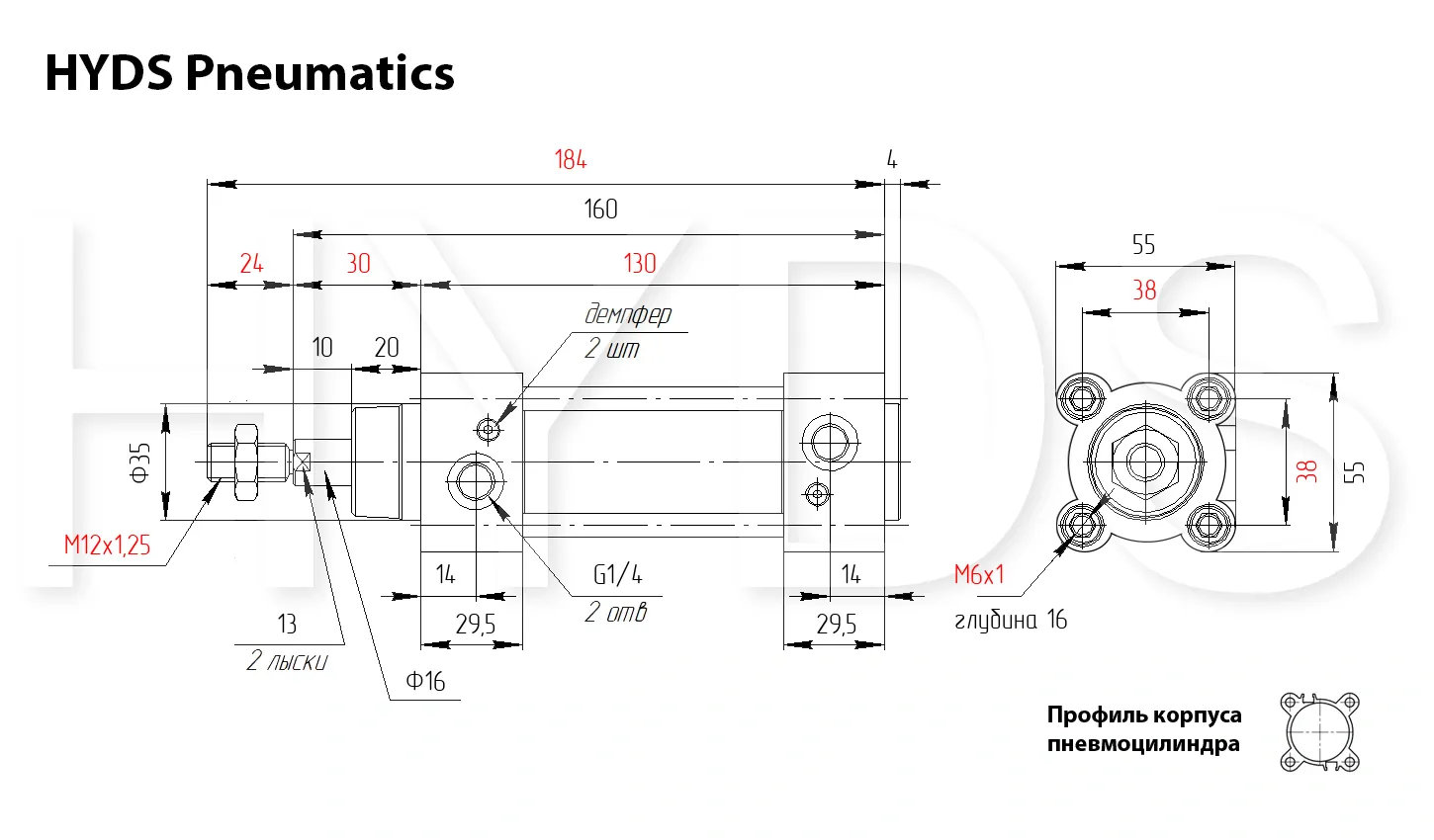 Пневмоцилиндр HYDS серии CP96, артикул CP96SDB40-25C с диаметром поршня 40 мм и длинной хода 25 мм, двухстороннего действия с односторонним штоком изготовленный по стандарту ISO 15552 (6431) / VDMA 24562, используется для преобразования энергии сжатого воздуха в механическую работу. Теоретическое усилие цилиндра при 6 Бар на выдвижение: 665 Н ~ (68 КГ), на втягивание: 559 Н ~ (57 КГ). Расход воздуха пневмоцилиндром при 6 Бар составляет: 0.405 Н/л за один цикл работы. Скорость движения штока без нагрузки: минимальная - 10 мм/сек, максимальная - 1000 мм/сек. Широкий выбор монтажных принадлежностей позволяет установить цилиндр где угодно.