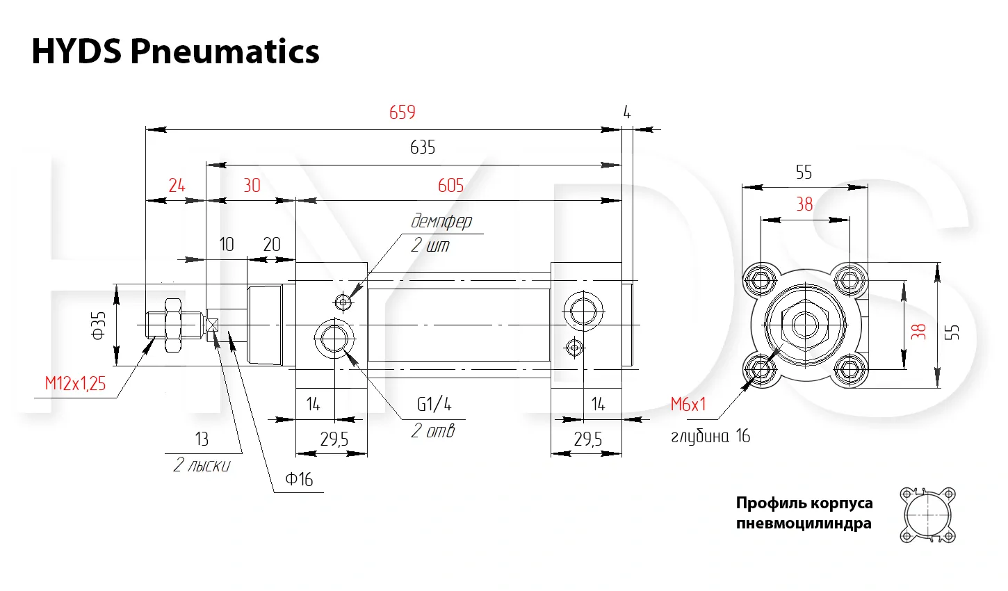 Пневмоцилиндр HYDS серии CP96, артикул CP96SDB40-500C с диаметром поршня 40 мм и длинной хода 500 мм, двухстороннего действия с односторонним штоком изготовленный по стандарту ISO 15552 (6431) / VDMA 24562, используется для преобразования энергии сжатого воздуха в механическую работу. Теоретическое усилие цилиндра при 6 Бар на выдвижение: 665 Н ~ (68 КГ), на втягивание: 559 Н ~ (57 КГ). Расход воздуха пневмоцилиндром при 6 Бар составляет: 8.1 Н/л за один цикл работы. Скорость движения штока без нагрузки: минимальная - 10 мм/сек, максимальная - 1000 мм/сек. Широкий выбор монтажных принадлежностей позволяет установить цилиндр где угодно.