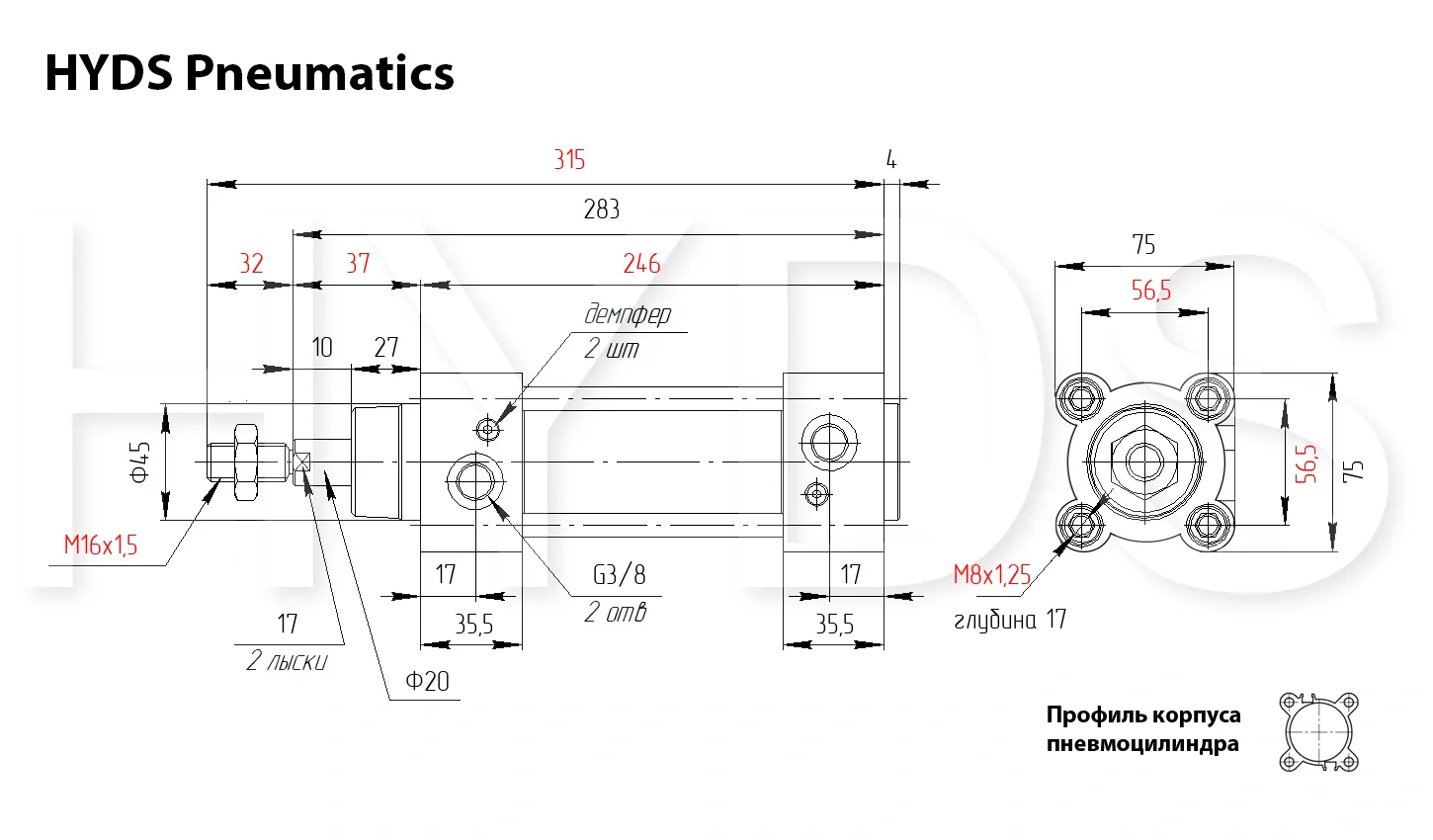 Пневмоцилиндр HYDS серии CP96, артикул CP96SDB63-125C с диаметром поршня 63 мм и длинной хода 125 мм, двухстороннего действия с односторонним штоком изготовленный по стандарту ISO 15552 (6431) / VDMA 24562, используется для преобразования энергии сжатого воздуха в механическую работу. Теоретическое усилие цилиндра при 6 Бар на выдвижение: 1651 Н ~ (168 КГ), на втягивание: 1484 Н ~ (151 КГ). Расход воздуха пневмоцилиндром при 6 Бар составляет: 5.175 Н/л за один цикл работы. Скорость движения штока без нагрузки: минимальная - 10 мм/сек, максимальная - 1000 мм/сек. Широкий выбор монтажных принадлежностей позволяет установить цилиндр где угодно.