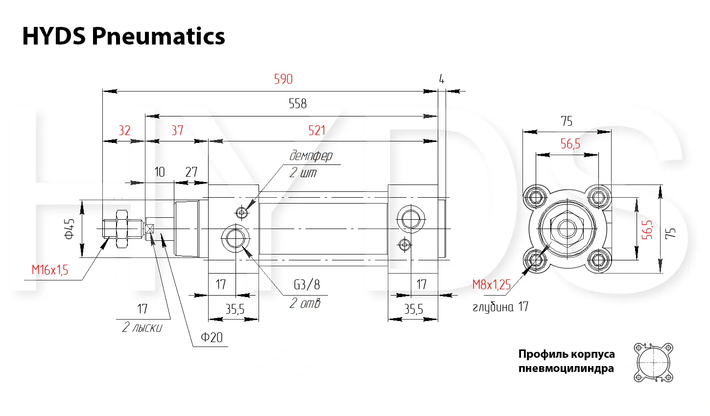 Пневмоцилиндр HYDS серии CP96, артикул CP96SDB63-400C с диаметром поршня 63 мм и длинной хода 400 мм, двухстороннего действия с односторонним штоком изготовленный по стандарту ISO 15552 (6431) / VDMA 24562, используется для преобразования энергии сжатого воздуха в механическую работу. Теоретическое усилие цилиндра при 6 Бар на выдвижение: 1651 Н ~ (168 КГ), на втягивание: 1484 Н ~ (151 КГ). Расход воздуха пневмоцилиндром при 6 Бар составляет: 16.56 Н/л за один цикл работы. Скорость движения штока без нагрузки: минимальная - 10 мм/сек, максимальная - 1000 мм/сек. Широкий выбор монтажных принадлежностей позволяет установить цилиндр где угодно.