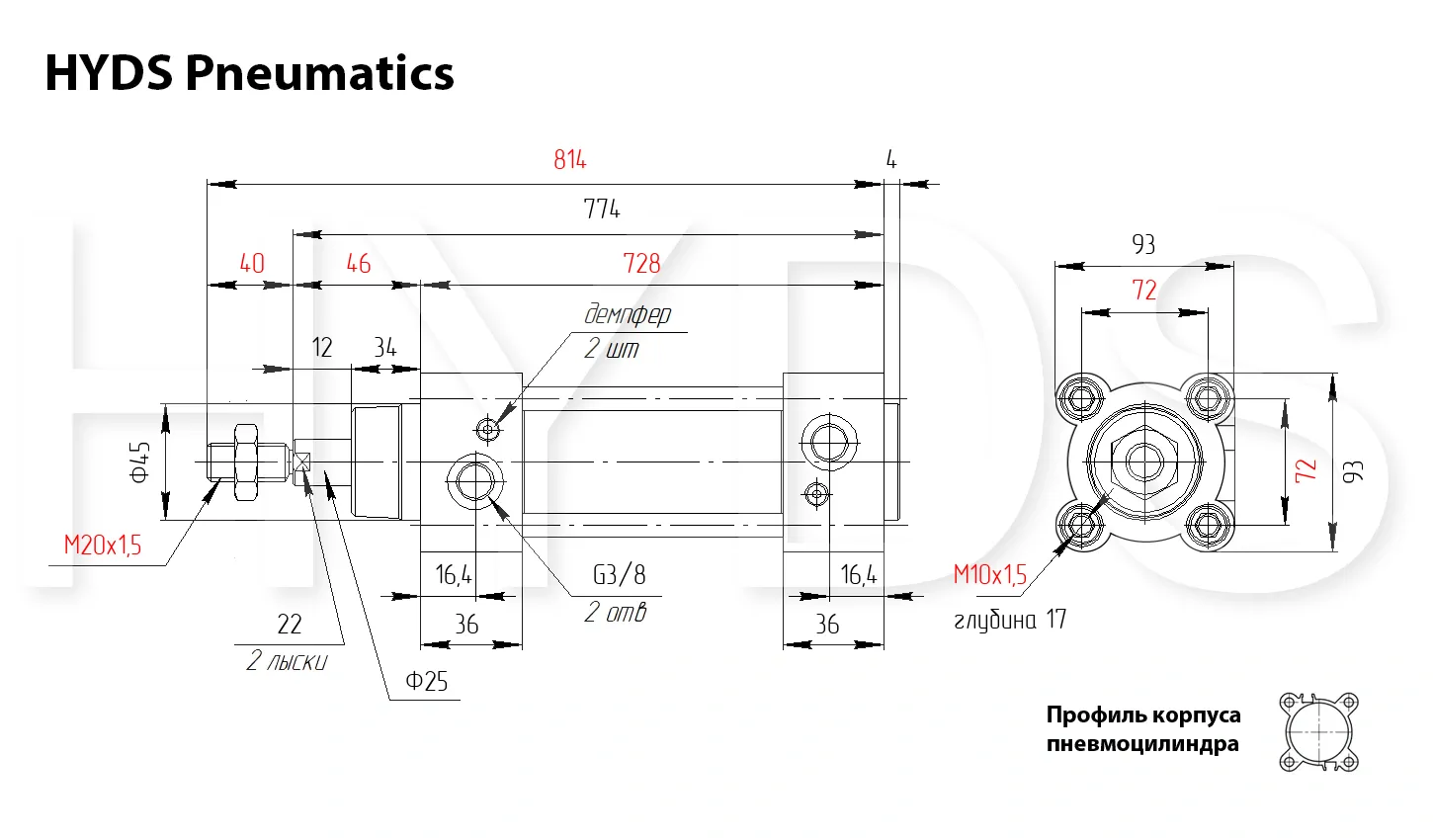 Пневмоцилиндр HYDS серии CP96, артикул CP96SDB80-600C с диаметром поршня 80 мм и длинной хода 600 мм, двухстороннего действия с односторонним штоком изготовленный по стандарту ISO 15552 (6431) / VDMA 24562, используется для преобразования энергии сжатого воздуха в механическую работу. Теоретическое усилие цилиндра при 6 Бар на выдвижение: 2661 Н ~ (271 КГ), на втягивание: 2402 Н ~ (245 КГ). Расход воздуха пневмоцилиндром при 6 Бар составляет: 40.14 Н/л за один цикл работы. Скорость движения штока без нагрузки: минимальная - 10 мм/сек, максимальная - 1000 мм/сек. Широкий выбор монтажных принадлежностей позволяет установить цилиндр где угодно.