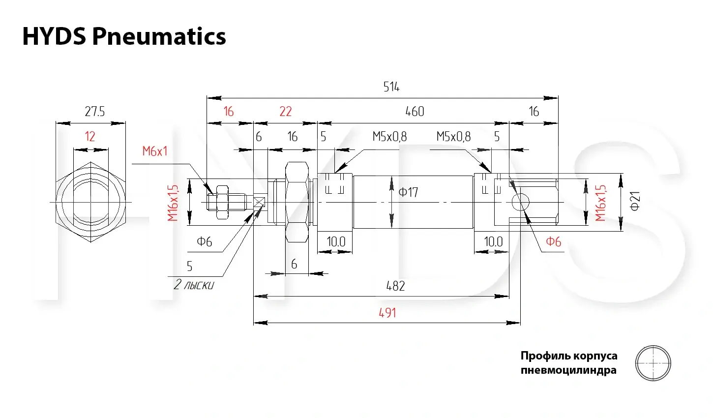 Круглый пневмоцилиндр HYDS серии MA, артикул MA 16x400-S с диаметром поршня 16 мм и длинной хода 400 мм, двухстороннего действия с односторонним штоком, используется для преобразования энергии сжатого воздуха в механическую работу. Теоретическое усилие цилиндра при 6 Бар на выдвижение: 107 Н (11 КГ), на втягивание: 92 Н (9 КГ). Расход воздуха пневмоцилиндром при 6 Бар составляет: 1.56 Н/л за один цикл работы. Скорость движения штока без нагрузки: минимальная - 10 мм/сек, максимальная - 1000 мм/сек. Широкий выбор монтажных принадлежностей позволяет установить цилиндр где угодно.