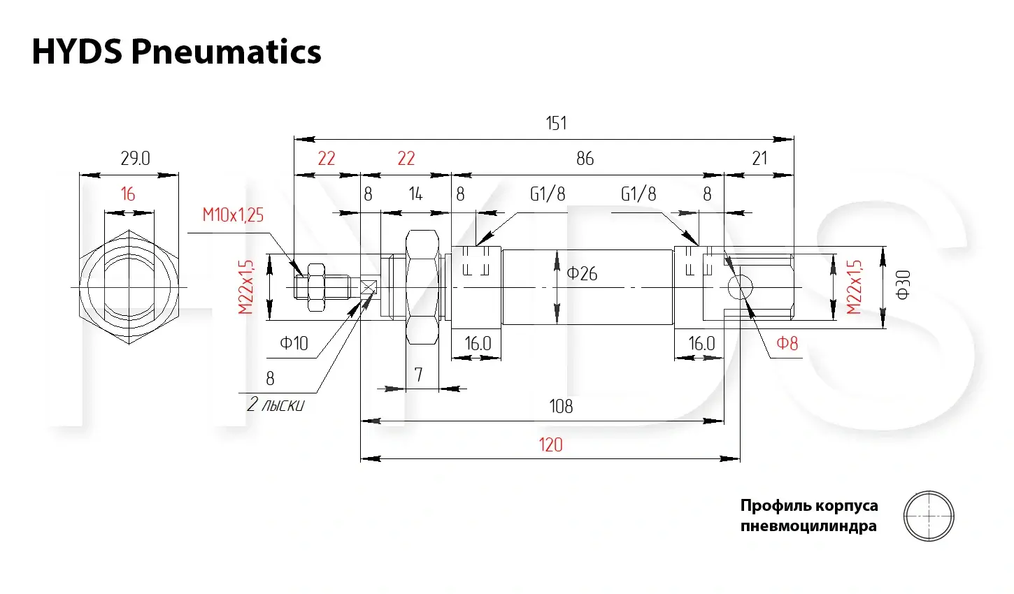 Круглый пневмоцилиндр HYDS серии MA, артикул MA 25x10-S с диаметром поршня 25 мм и длинной хода 10 мм, двухстороннего действия с односторонним штоком, используется для преобразования энергии сжатого воздуха в механическую работу. Теоретическое усилие цилиндра при 6 Бар на выдвижение: 260 Н (27 КГ), на втягивание: 218 Н (22 КГ). Расход воздуха пневмоцилиндром при 6 Бар составляет: 1.034 Н/л за один цикл работы. Скорость движения штока без нагрузки: минимальная - 10 мм/сек, максимальная - 1000 мм/сек. Широкий выбор монтажных принадлежностей позволяет установить цилиндр где угодно.