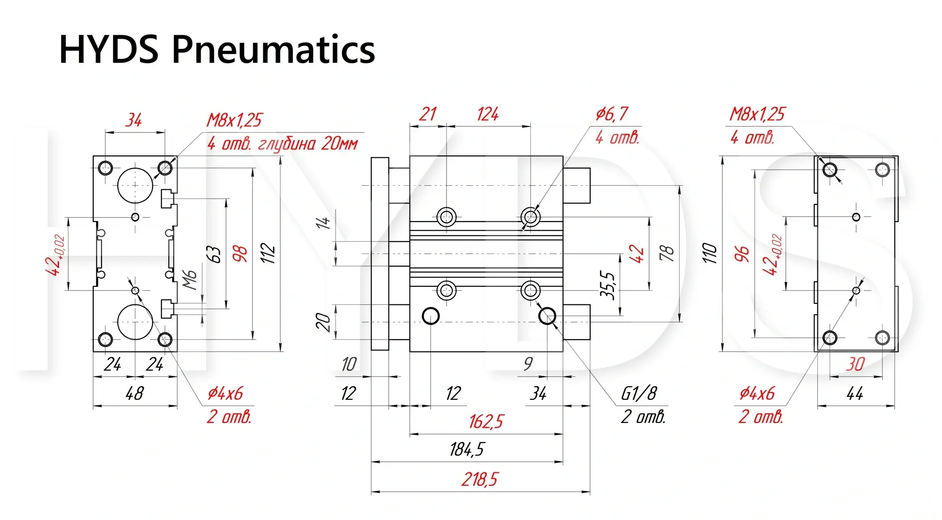 Плоский пневмоцилиндр с направляющей HYDS серии MGPM, артикул MGPM32TF-125Z с диаметром поршня 32 мм и длинной хода 125 мм, двухстороннего действия с односторонним штоком, используется для преобразования энергии сжатого воздуха в механическую работу. Теоретическое усилие цилиндра при 6 Бар на выдвижение: 426 Н (43 КГ), на втягивание: 366 Н (37 КГ). Расход воздуха пневмоцилиндром при 6 Бар составляет: 1.7 Н/л за один цикл работы. Скорость движения штока без нагрузки: минимальная - 10 мм/сек, максимальная - 500 мм/сек.