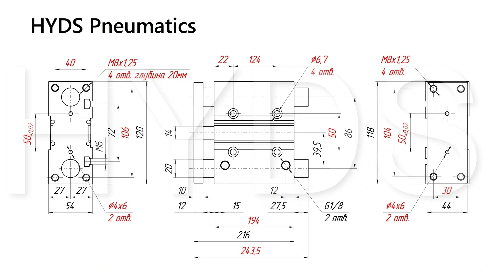 Плоский пневмоцилиндр с направляющей HYDS серии MGPM, артикул MGPM40TF-150Z с диаметром поршня 40 мм и длинной хода 150 мм, двухстороннего действия с односторонним штоком, используется для преобразования энергии сжатого воздуха в механическую работу. Теоретическое усилие цилиндра при 6 Бар на выдвижение: 665 Н (68 КГ), на втягивание: 559 Н (57 КГ). Расход воздуха пневмоцилиндром при 6 Бар составляет: 2.32 Н/л за один цикл работы. Скорость движения штока без нагрузки: минимальная - 10 мм/сек, максимальная - 500 мм/сек.