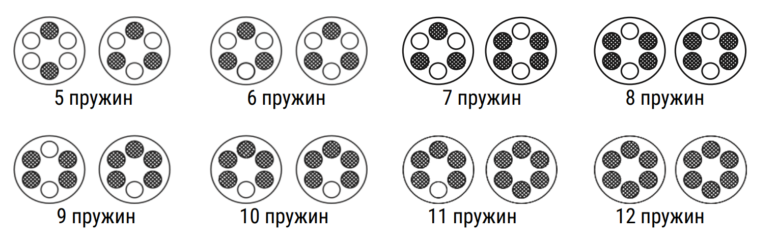 | Количество пружин | Угол поворота | Усилие пружин | Давление в системе, Бар | |||||||||