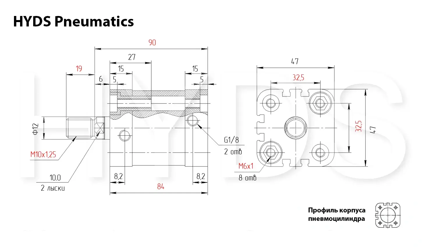 Компактный пневмоцилиндр HYDS серии ADN, артикул ADN-32-40-A-P-A с диаметром поршня 32 мм и длинной хода 40 мм, двухстороннего действия с односторонним штоком изготовленный по стандарту ISO 21287, используется для преобразования энергии сжатого воздуха в механическую работу. Теоретическое усилие цилиднра при 6 Бар на выдвижение: 426 Н ~ (43 КГ), на втягивание: 366 Н ~ (37 КГ). Расход воздуха пневмоцилиндром при 6 Бар составляет: 0.416 Н/л за один цикл работы. Скорость движения штока без нагрузки: минимальная - 10 мм/сек, максимальная - 1000 мм/сек. Широкий выбор монтажных принадлежностей позволяет установить цилиндр где угодно.
