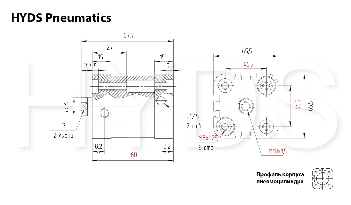 Компактный пневмоцилиндр HYDS серии ADN, артикул ADN-50-15-I-P-A с диаметром поршня 50 мм и длинной хода 15 мм, двухстороннего действия с односторонним штоком изготовленный по стандарту ISO 21287, используется для преобразования энергии сжатого воздуха в механическую работу. Теоретическое усилие цилиднра при 6 Бар на выдвижение: 1039,6 Н ~ (106 КГ), на втягивание: 873,3 Н ~ (89 КГ). Расход воздуха пневмоцилиндром при 6 Бар составляет: 0.39 Н/л за один цикл работы. Скорость движения штока без нагрузки: минимальная - 10 мм/сек, максимальная - 1000 мм/сек. Широкий выбор монтажных принадлежностей позволяет установить цилиндр где угодно.