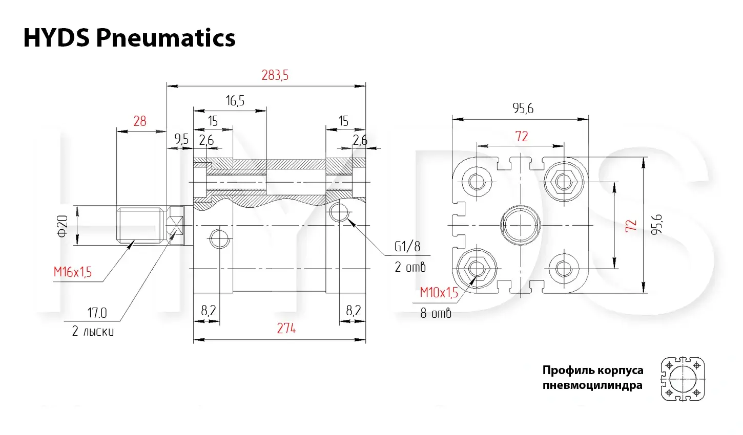 Компактный пневмоцилиндр HYDS серии ADN, артикул ADN-80-220-A-P-A с диаметром поршня 80 мм и длинной хода 220 мм, двухстороннего действия с односторонним штоком изготовленный по стандарту ISO 21287, используется для преобразования энергии сжатого воздуха в механическую работу. Теоретическое усилие цилиднра при 6 Бар на выдвижение: 2661 Н ~ (271 КГ), на втягивание: 2402 Н ~ (245 КГ). Расход воздуха пневмоцилиндром при 6 Бар составляет: 15.004 Н/л за один цикл работы. Скорость движения штока без нагрузки: минимальная - 10 мм/сек, максимальная - 1000 мм/сек. Широкий выбор монтажных принадлежностей позволяет установить цилиндр где угодно.