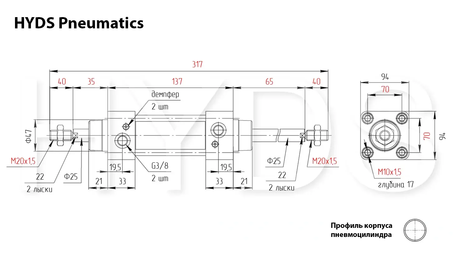 Пневмоцилиндр HYDS серии SCD, артикул SCD 80x30-S с диаметром поршня 80 мм и длинной хода 30 мм, двухстороннего действия с двусторонним штоком изготовленный по стандарту ISO 6430, используется для преобразования энергии сжатого воздуха в механическую работу. Теоретическое усилие цилиднра при 6 Бар на выдвижение: 2402 Н ~ (245 КГ), на втягивание: 2402 Н ~ (245 КГ). Расход воздуха пневмоцилиндром при 6 Бар составляет: 1.902 Н/л за один цикл работы. Скорость движения штока без нагрузки: минимальная - 10 мм/сек, максимальная - 1000 мм/сек. Широкий выбор монтажных принадлежностей позволяет установить цилиндр где угодно.